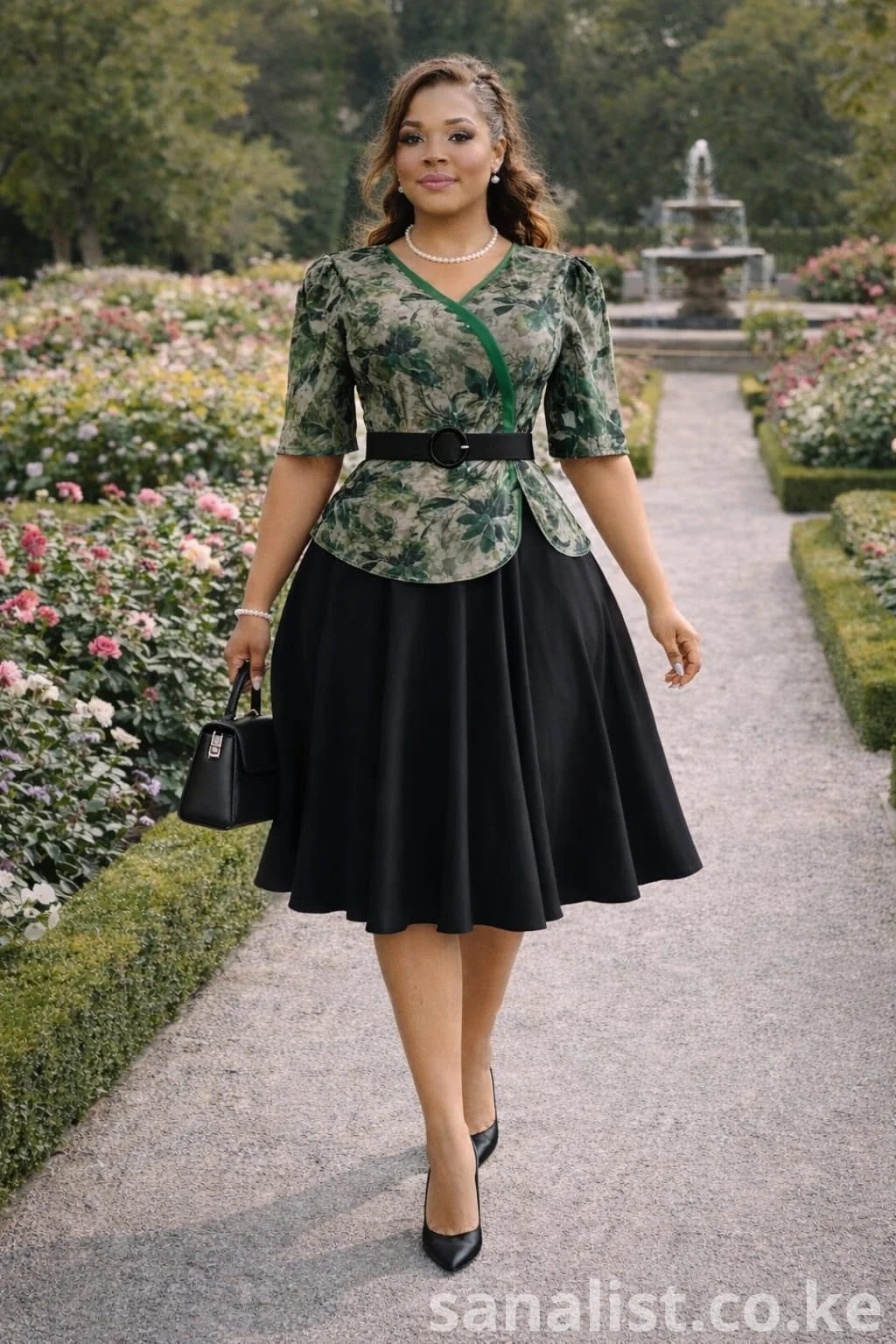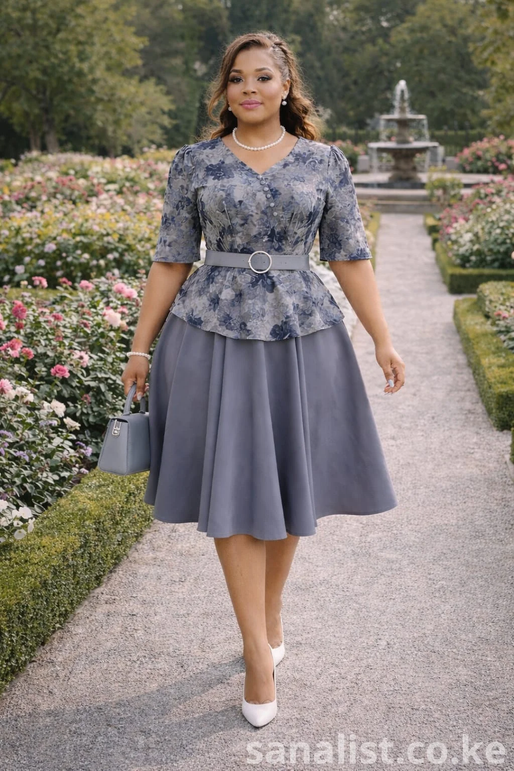 This outfit is an elegant plus size two‑piece set featuring a peplum top and flared midi skirt, designed to flatter curvy women and give a sophisticated, feminine look.