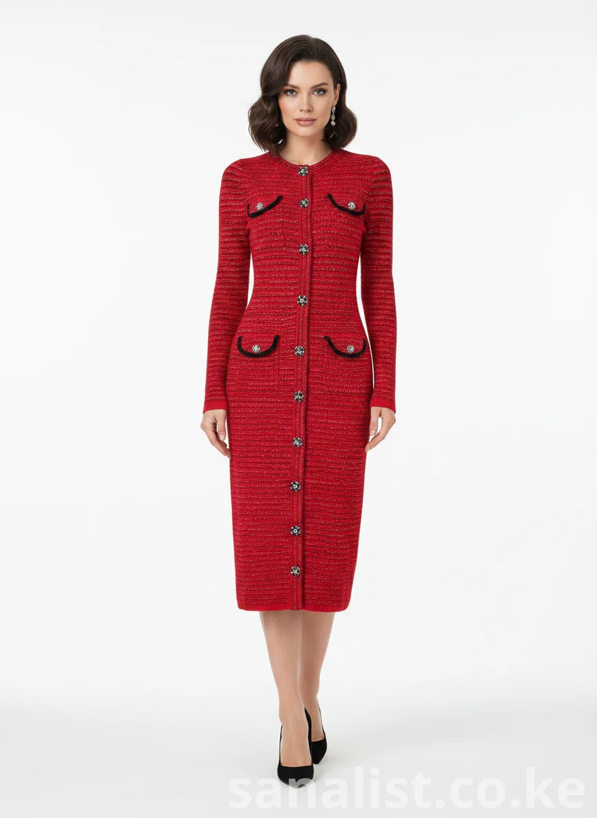 Make a confident statement in this chic red textured knit midi dress. Designed with a flattering bodycon fit, long sleeves, and a stylish button-front look with elegant contrasting trim details, it’s perfect for women who want a polished outfit for office, church, dinners, events, and special occasions.